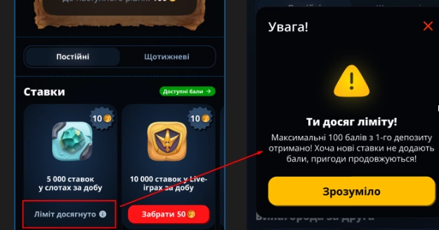 - Ліміт ставок на 1 депозит. Є два типи завдань (по сумі і кількості ставок), де гравець має максимально можливу кількість набраних балів – це 100. Якщо гравець досяг ліміту – він побачить про це інформацію біля цього завдання. Ліміт буде знято лише внесенням наступного депозиту.