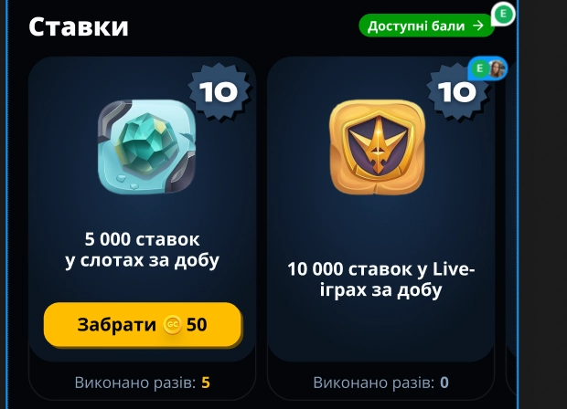 - За ставки. Приклад: зроби за добу ставок на 5000₴ у слотах і отримай 5S